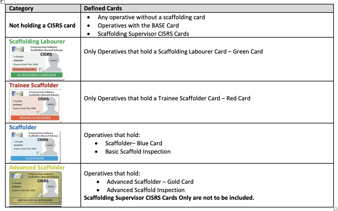 To capture the operatives that conduct scaffolding work on a part time or a few days a week in the Operative Tracker, the percentage of their time needs to be captured. Examples are: