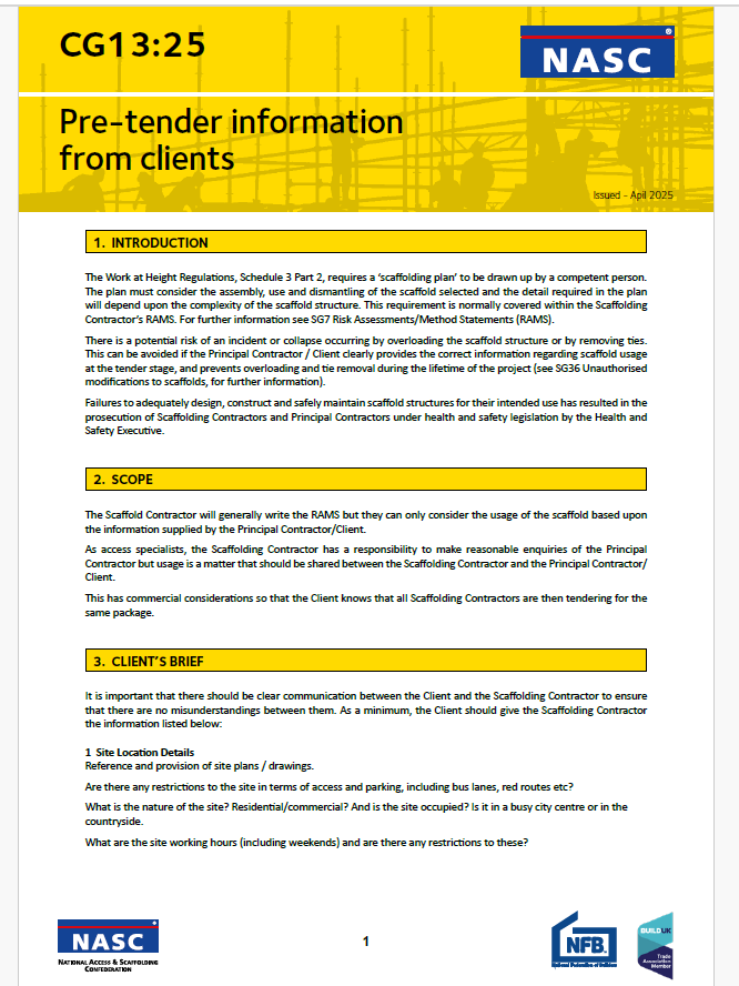 This guidance note sets out the information that the Scaffolding Company should seek from the Employer. This information will be used by the Scaffolding Company in order to produce their Quotation and will be the basis for their offer. It is important that the Scaffolding Contractor obtains as much information about the Project as possible prior to firming up their price in order to reduce the risk they are exposed to. 4 pages